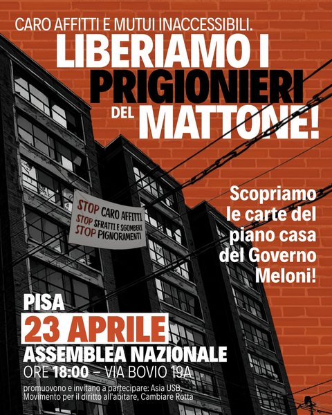 Invitiamo ad unirsi al picchetto solidale mercoledì mattina in via delle Agavi a Tirrenia e giovedì pomeriggio all’assemblea “Liberiamo i prigionieri del mattone”