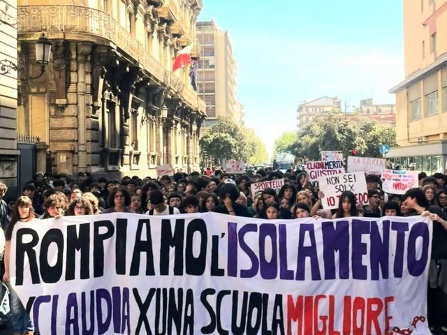 Claudia, una studentessa che frequentava il quarto ginnasio presso il Liceo Cutelli, si è tolta la vita buttandosi dal 7° piano della sua abitazione perché - come denunciano le studentesse e gli studenti scesi oggi in piazza - "vittima di bullismo e di mancanza di ascolto...e non è morta solo per un suo dolore privato, ma per un sistema che ogni giorno le ha tolto l’aria. Il sistema scolastico ritiene che i nostri problemi siano fatti individuali, personali, da affrontare singolarmente con uno psicologo privato, a pagamento. Ha fatto propria la logica che ci vuole tutti vincenti, dritti, anche se tu ti stai spezzando dentro. I problemi e le debolezze sono considerati come una vergona che ti devi tenere dentro".